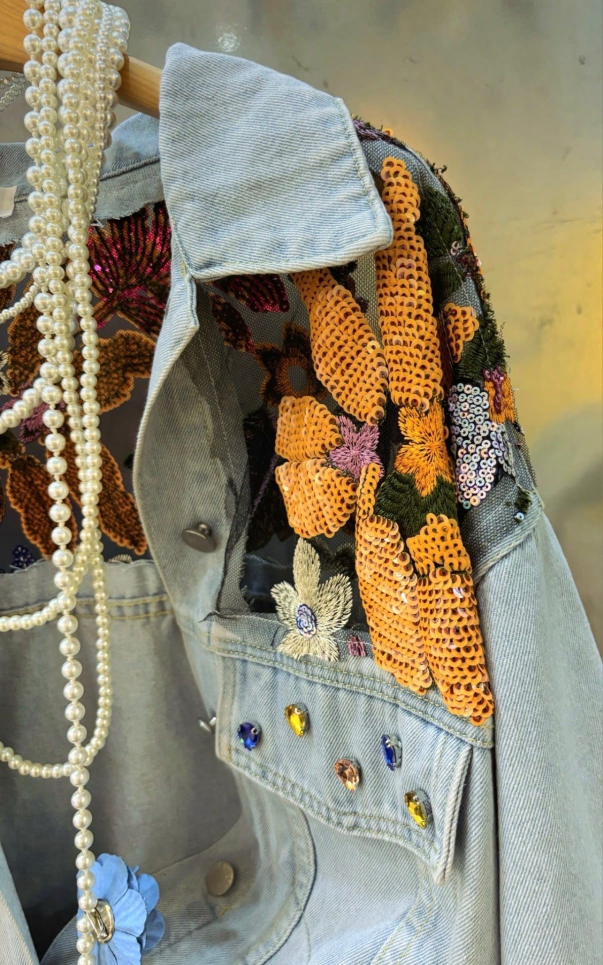 オレンジのスパンコール刺繍が派手な個性的なライトブルゾン